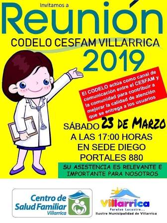 VILLARRICA.- Mañana sábado 23 de marzo, a las 17:00 horas, sesionará por primera vez en el año, el Consejo de Desarrollo Local (CODELO) del CESFAM Villarrica, la actividad tendrá lugar en la sede de la Junta de Vecinos de la Población Diego Portales.